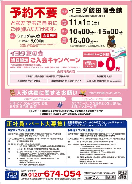〇 当日のご入会でも供養料は無料です!! 人形供養開催記念 イヨダ友の会ご入会、通常1万円のところ「無料」に ・万が一の時のご葬儀代が会員様価格 ・仏壇、お位牌の割引販売 ・各種専門分野のアフターサポート ・各種イベント優待 などなど ご入会金のみで、年会費・積立金はございません。 この機会に是非、ご入会ください!!